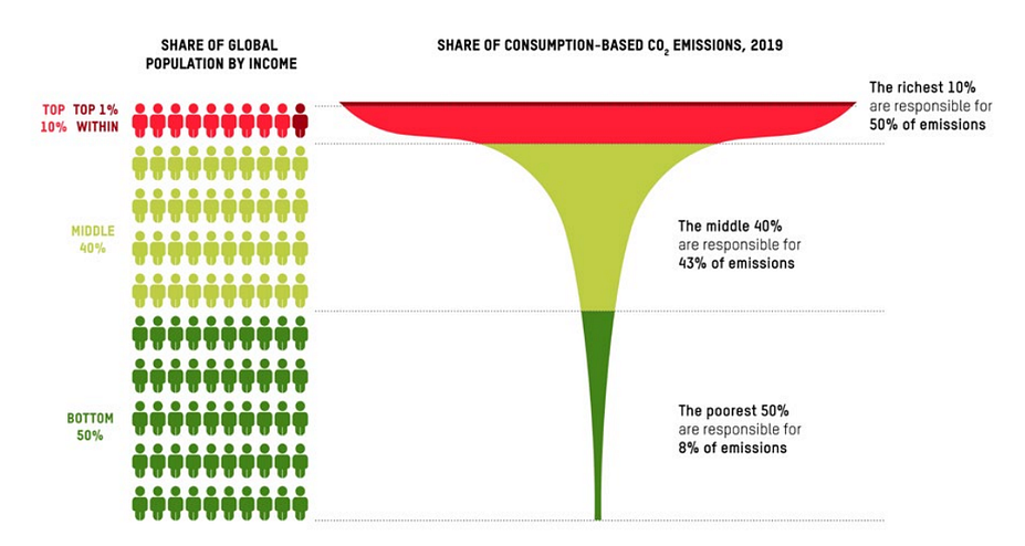 Each of us is confined to living in a world that feels increasingly small, rapidly accelerating toward an inhospitable future. Every summer is hotter than the last, and we are forced to adapt to a planet undergoing the drastic effects of climate change. All of this raises an important question: who is dragging us toward this perilous future? As it turns out, the top 1% of the world’s population is responsible for twice the amount of carbon emissions as the poorest 50% (Oxfam, 2023), exacerbating carbon inequality and accelerating climate change. In this post, we will examine the disproportionate carbon footprint of the wealthiest individuals, explore how this compares to the rest of the population, and discuss various methods we can use to address carbon inequality.